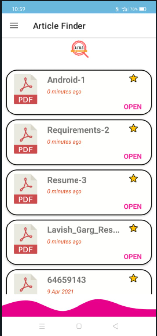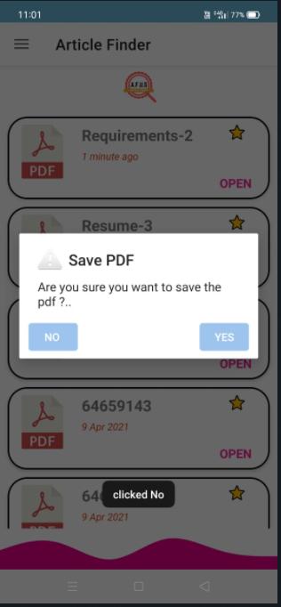 Pdf saver app in which user can save his/her pdf,pdf will be displayed in order of ascending order of time, user can save the pdf by clicking on the star icon,and the pdf will be saved in saved pdf folder in the app, user can update his/her profile image,can share the pdf with other social apps.
