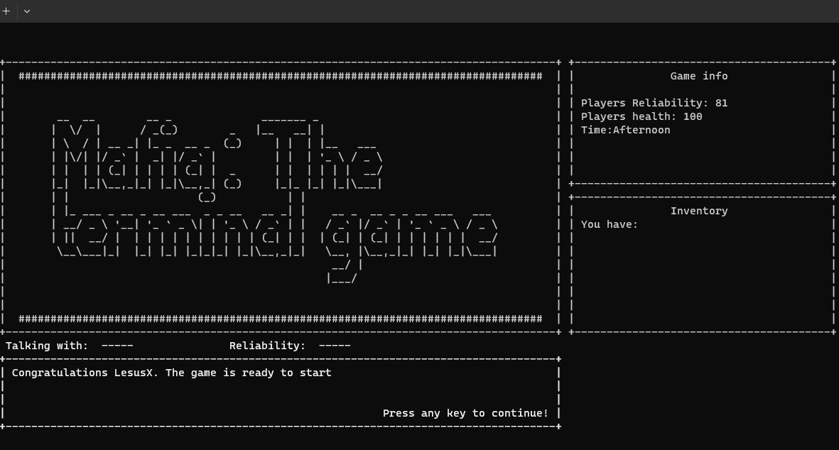 Note: Most AsCII art was sourced from all over the internet and I don't remember where I found each art work. Feel free to download and modify the game in any way you want.