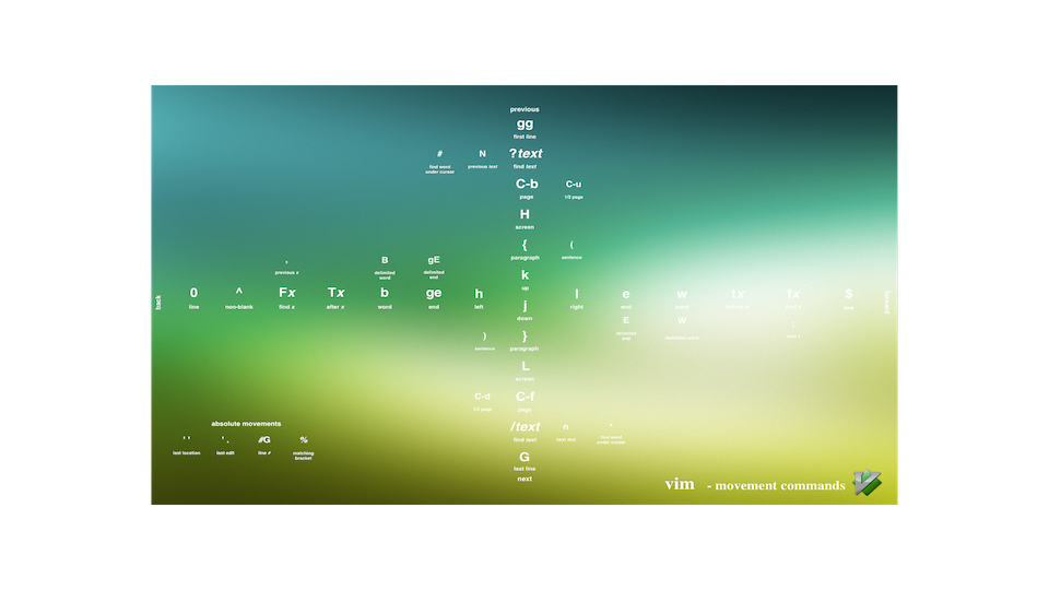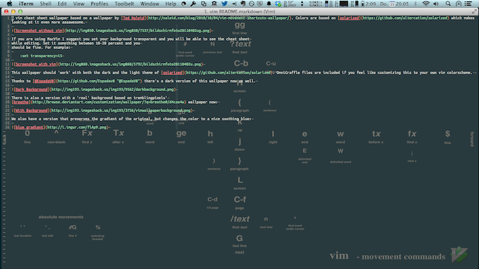 A vim cheat sheet wallpaper based on a wallpaper by Ted Naleid. Colors are based on solarized which makes looking at it even more aaaawesome.