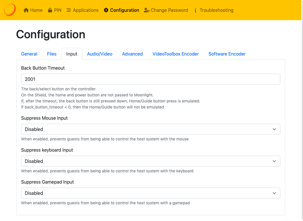 This PR adds three new settings that allow suppressing client input from the mouse, keyboard, and gamepads, one for each type of input. They can be toggled individually, allowing any combination of allowable input the user desires. This also allows for disabling client input entirely, putting Sunshine in a "view only" mode.