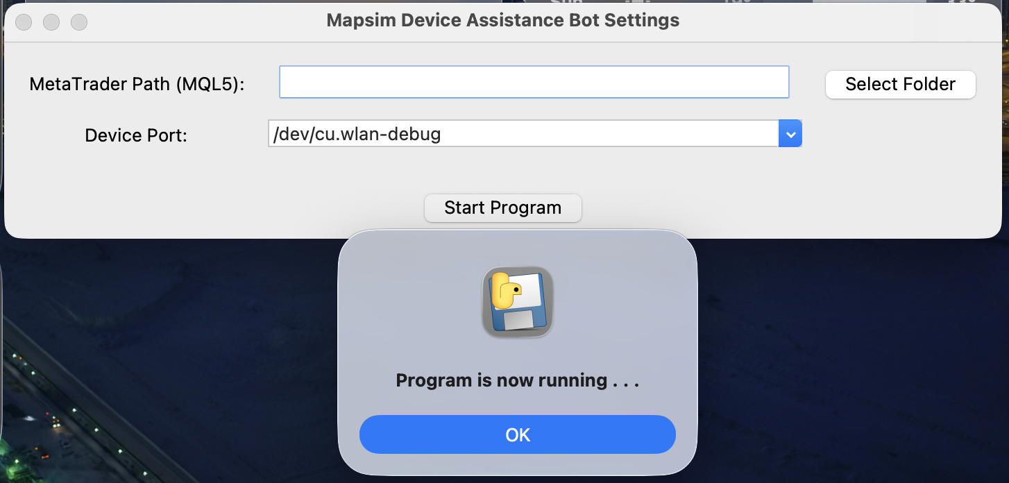 Mapsim Device Software A companion application that bridges the hardware with MetaTrader 5. Must be running on your computer to use the Mapsim Device.