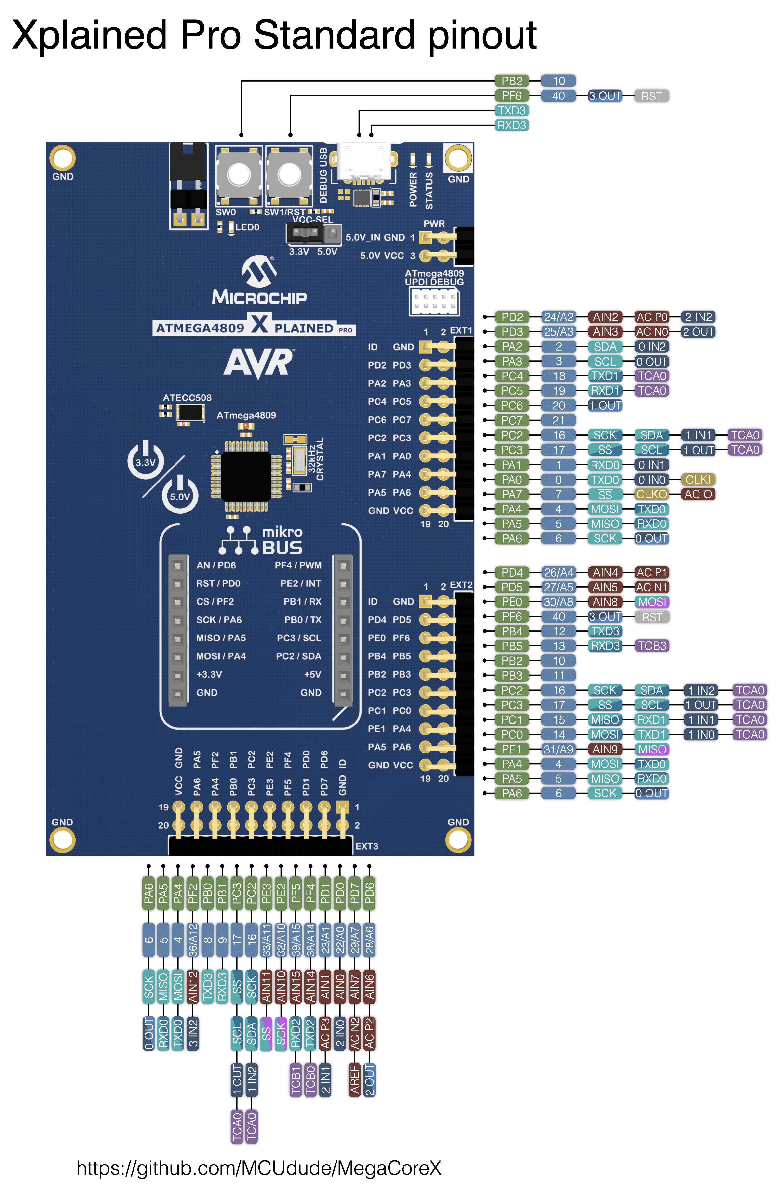 - 32 pin standard: This is the pinout for the 32 pin version of the ATmega3208/4808. Again, it will not be compatible with shields or anything like that, but it's clean and elegant from a hardware point of view. The only pin swap done by default is the PWM output pins. This is done to prevent them from "colliding" with other peripherals.