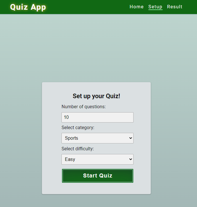 Users can generate their own custom quiz and then play it. They are able to choose the number of questions, category and difficulty level.
