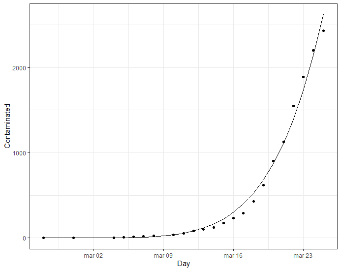 Esse projeto, feito em março de 2020, tem o intuito de encontrar uma curva que se ajuste a uma série de dados referentes a contaminação por dia pelo COVID-19, através de uma regressão não linear no R. Também é possível utilizar a função predict para fazer uma "previsão" baseado nesse modelo bem simples.