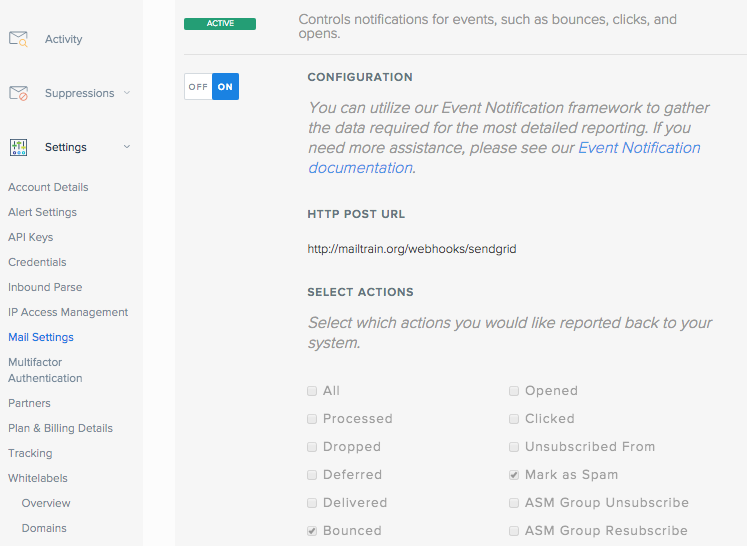 - Check "Bounced" and "Mark as Spam" checkboxes and set webhook url to