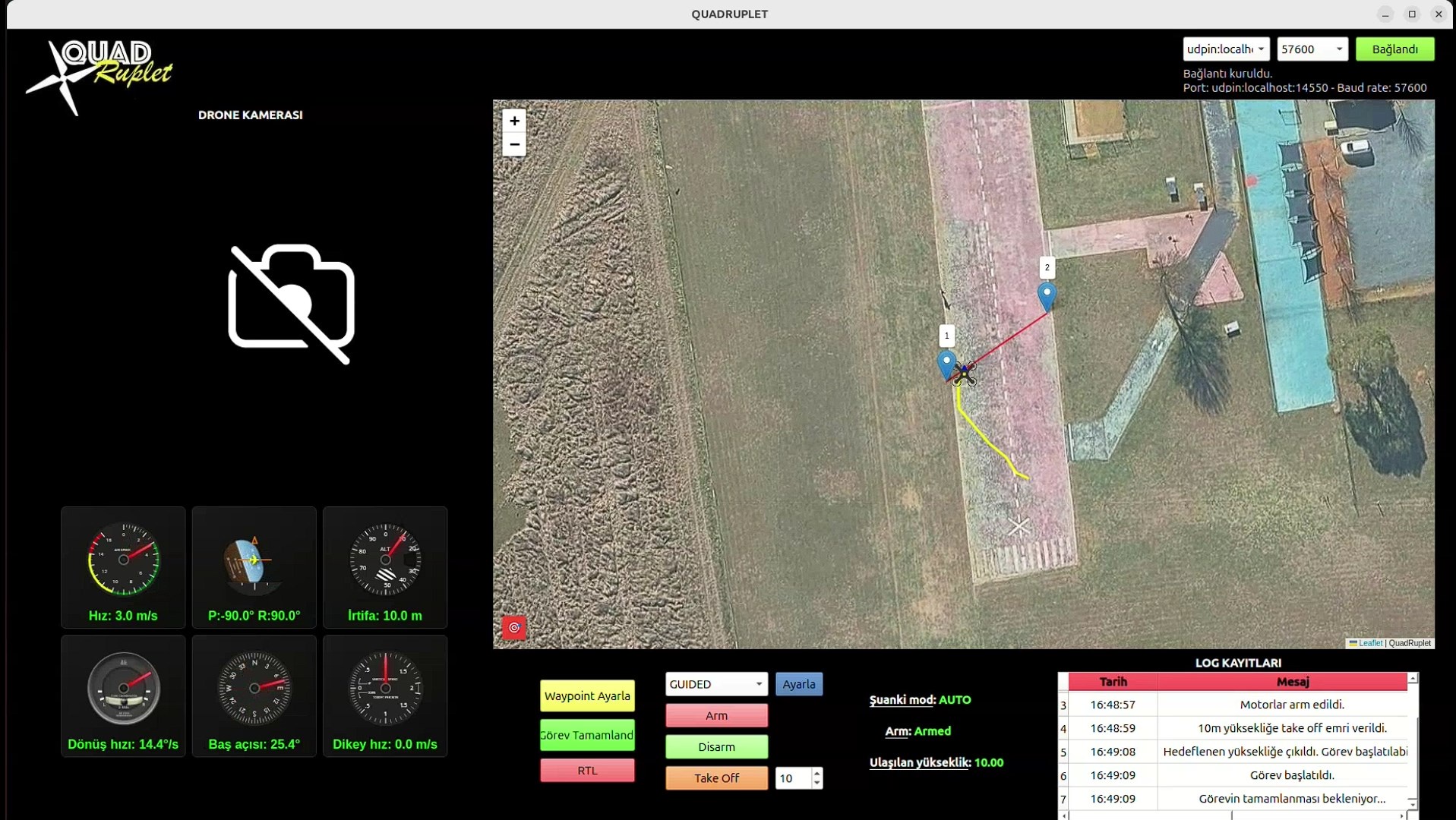 Arayüz, gerçek zamanlı telemetri verilerini, harita üzerinde uçuş rotasını, kontrol butonlarını, rota oluşturma penceresini, İHA kamera görüntüsünü ve log kayıtlarını kullanıcıya sunar.