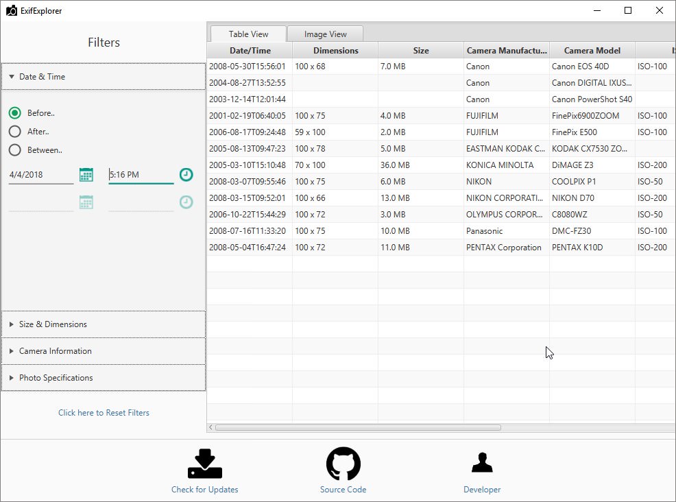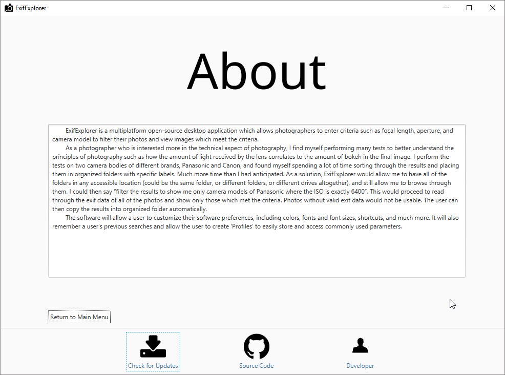 ExifExplorer is a multiplatform open-source desktop application which allows photographers to enter criteria such as focal length, aperture, and camera model to filter their photos and view images which meet the criteria.