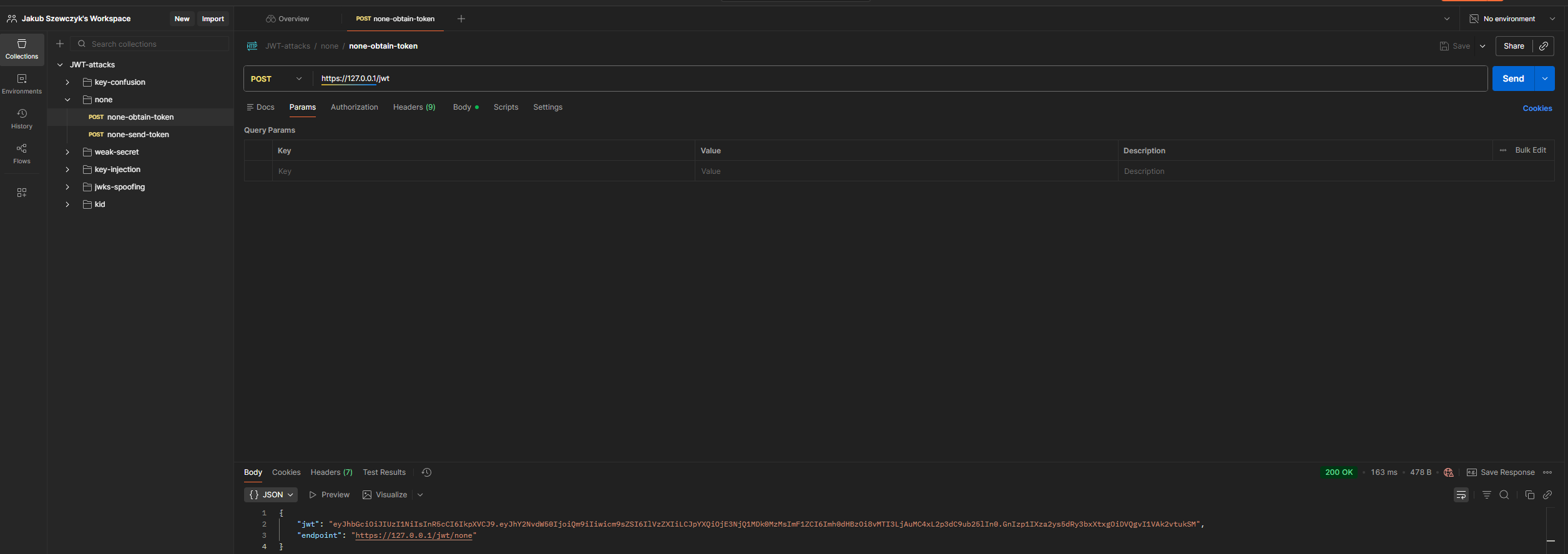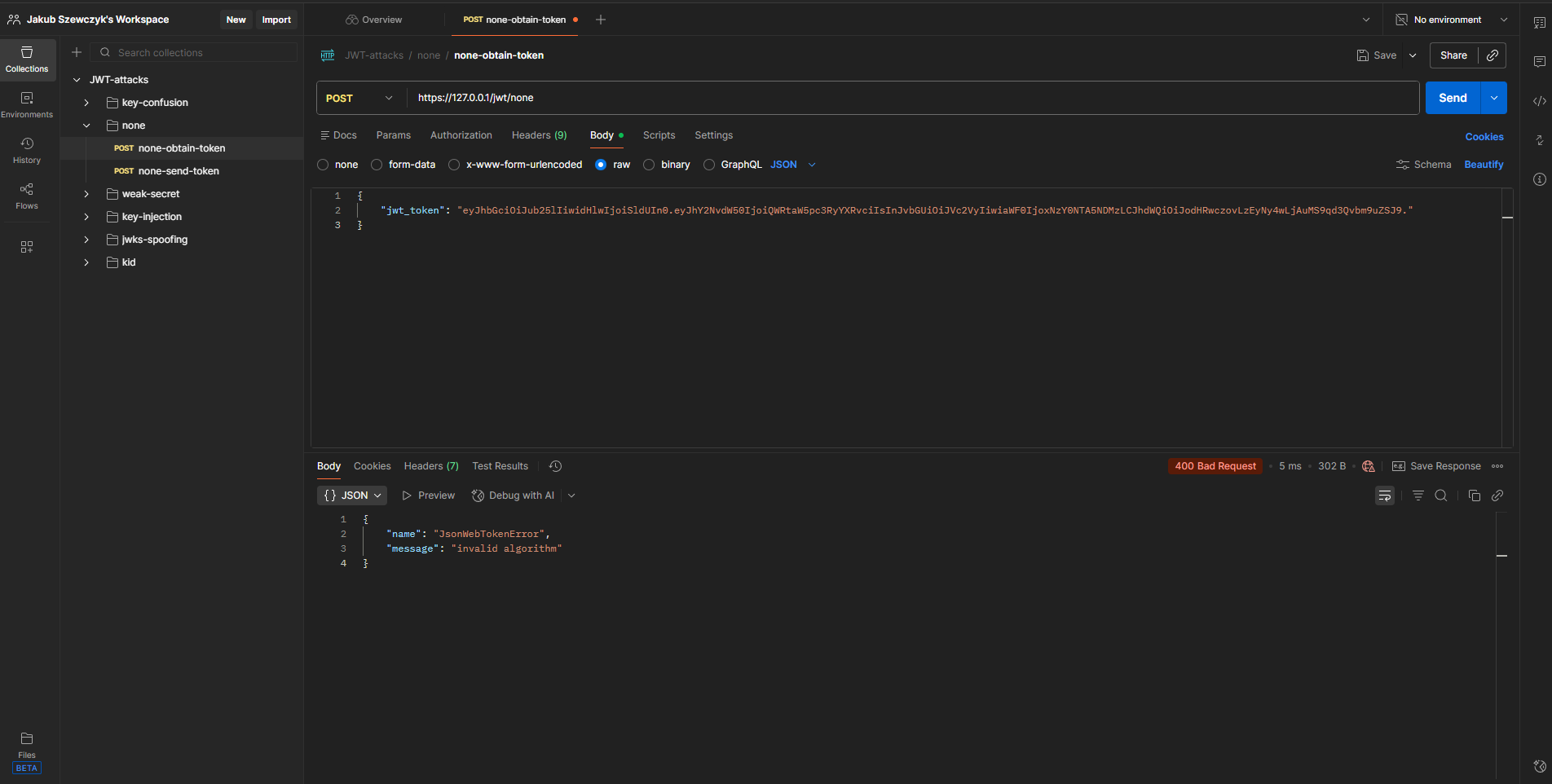 JWT/jwt-signature-apis-challanges/app.jsonpolegała na usunięciu z algorithd (linia 34)'none'. Dzięki temu request jest blokowany bo nie ma już w puli algorytmu'none'.