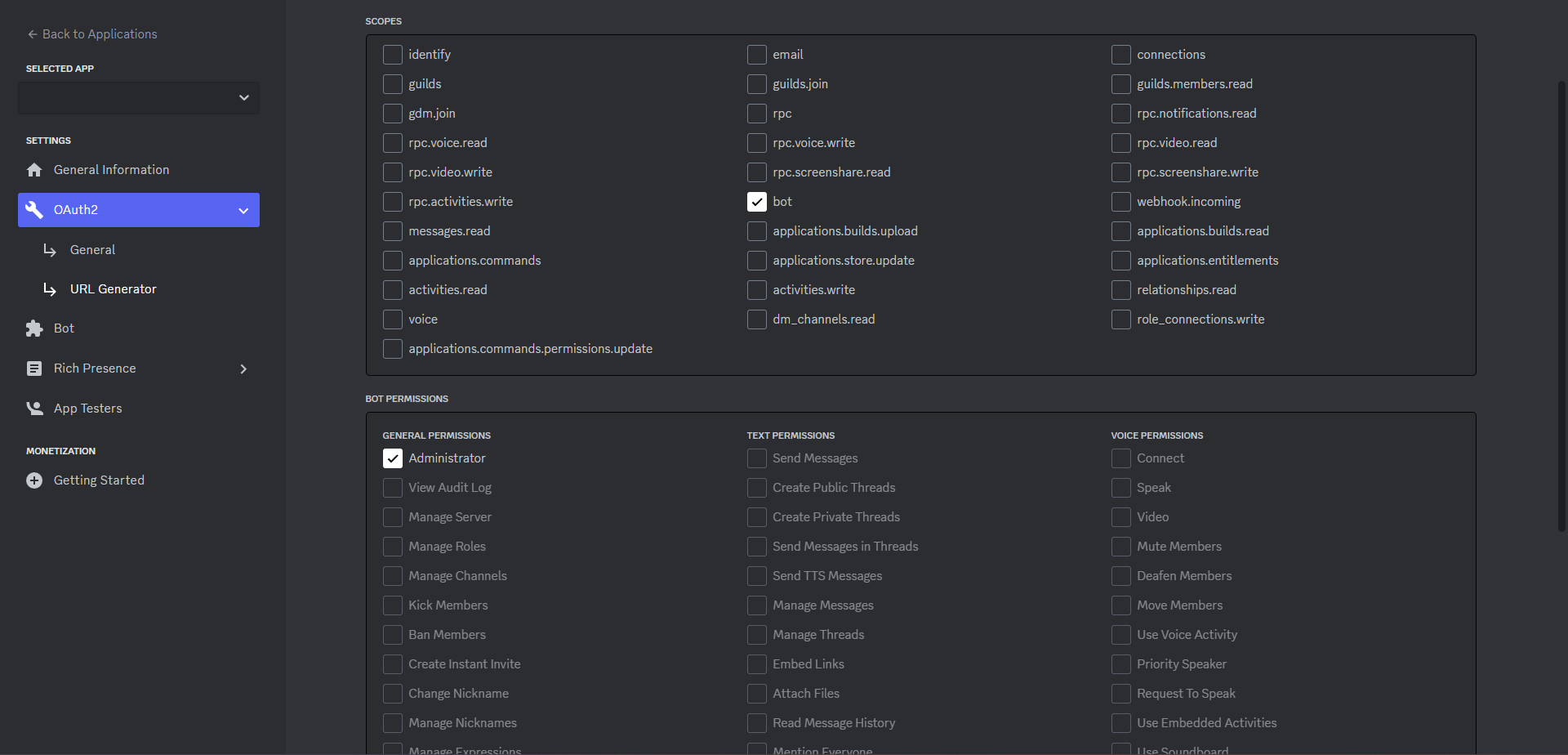 - Go to OAuth2 -> URL Generator and tick bot and Administrator