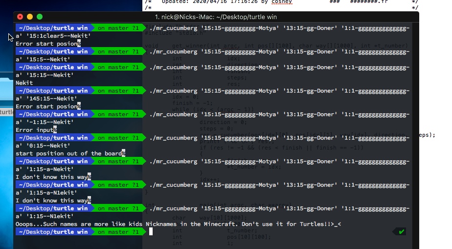 TURTLES Winner, winner .. ..Squirtle Dinner ! UPDATES 17.04 It's choose correct Winner. Added all types or error check. Need Vusial part + check for lenght of the way and name 15.04 It's display correct winner! Need the check the input data
