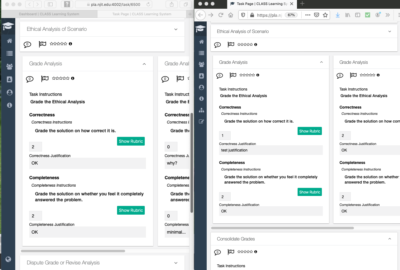 (Problem 1) What's the problem?: Needs consolidation is unreliable. The first image below will show you two needs consolidations TIs in the same WA. One triggered the consolidation task, and the other bypassed the consolidation task, even though the assessment scores for the latter had a larger difference. This was an example with numeric grades.