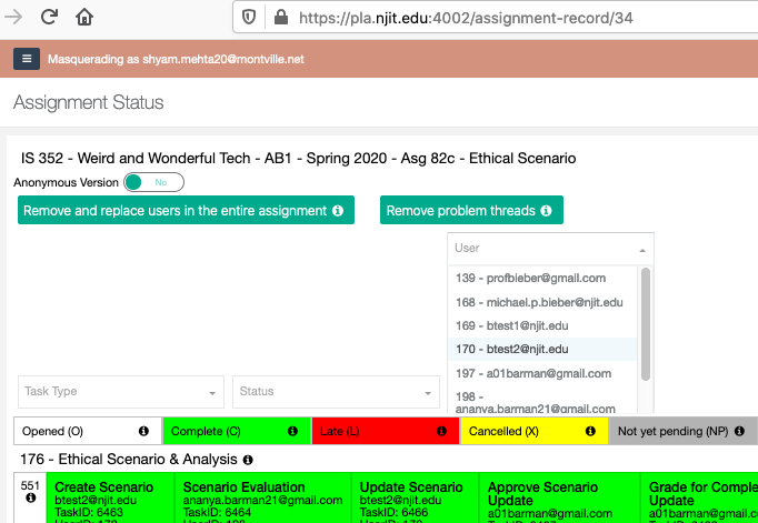 The Assignment Status screen can be filtered by various criteria at the top of the screen. The user filter only has the user's UserID and email address. But instructors often know their students only by their names and not their email address. So please add the user name (LN, FN) to the drop-down list. If possible, sort the list by LN, FN.