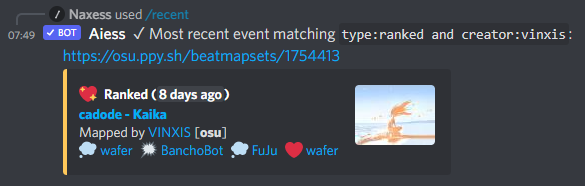 Aiess gathers mapping-related events in osu! (e.g. ranks, qualifications, nominations, suggestions, newsposts, group changes, etc), and provides the ability to subscribe to these events through a Discord bot.