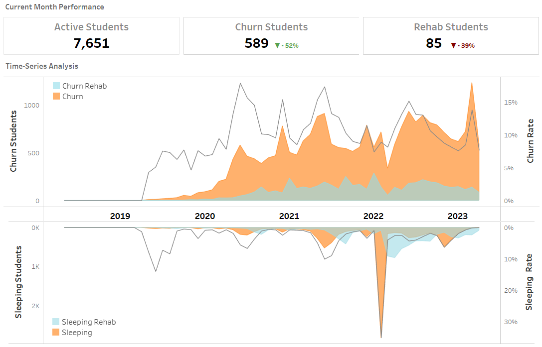 I used Tableau to develop a simple, yet effective, dashboard that displayed time-series visualizations of churn and sleeping students. To ensure that my data was up-to-date, I scheduled incremental data updates. By leveraging these techniques, I was able to gain valuable insights into the churn behavior of online school students.