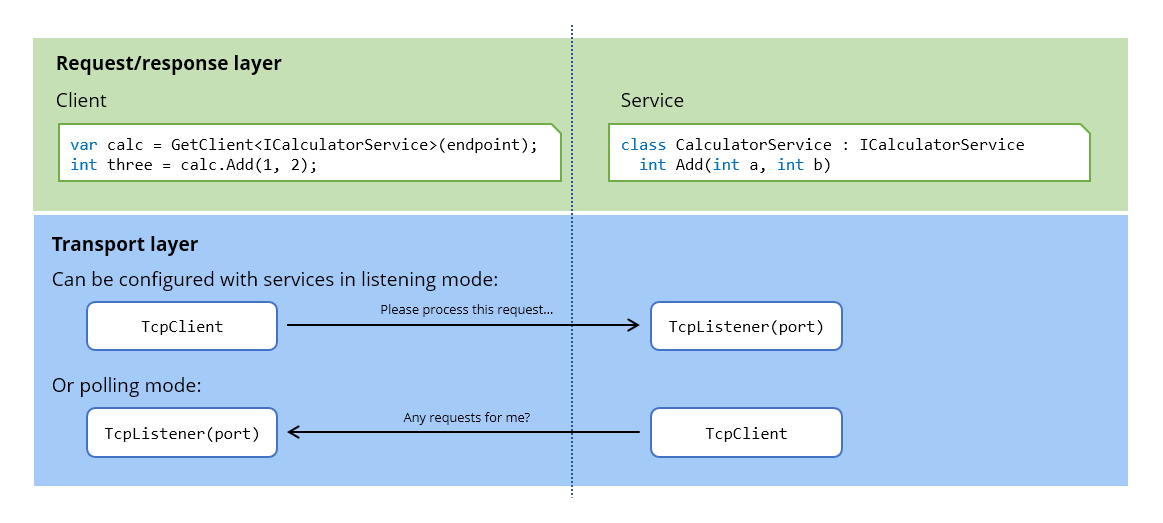Like WCF and other RPC-based communication frameworks, Halibut uses a simple request/response based programming model. However, unlike other request/response frameworks, the transport layer can be configured to allow either party to be a TCP listener or TCP client.