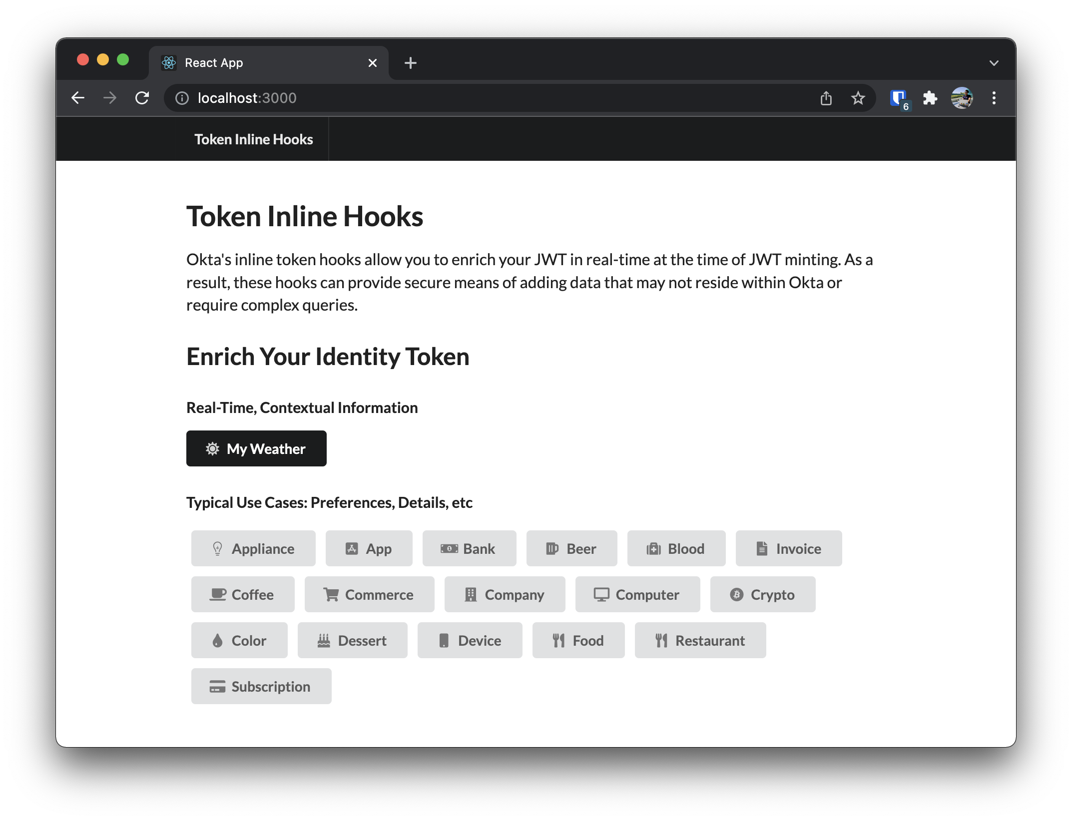 This application is mainly used for demostration purposes to show the capabilities of Okta's inline hooks. It provides different various hooks upon prescribed scopes. End-users can select what type of data will be enriched to the identity token upon minting.