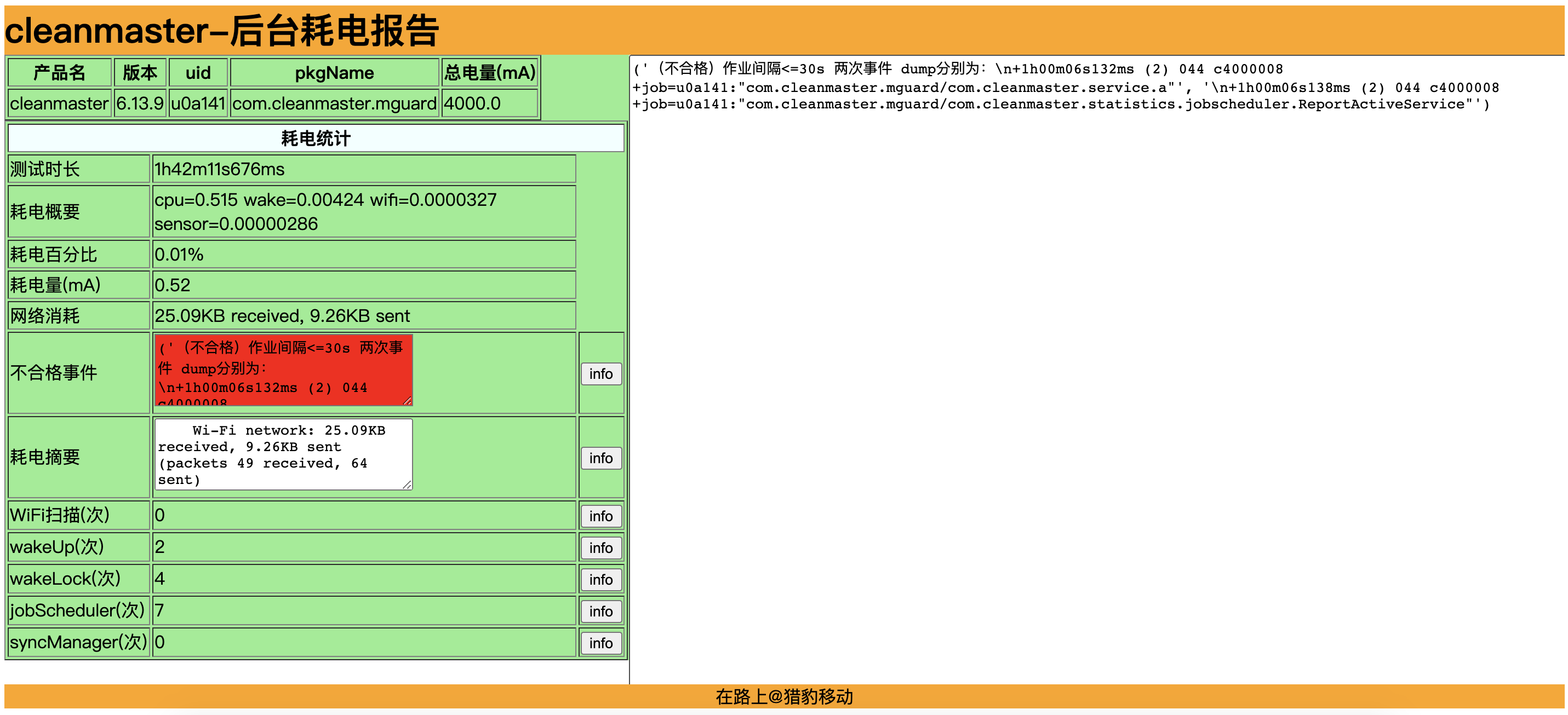 通过分析bugreport文件,统计后台耗电各项指标,以及指标是否合格。