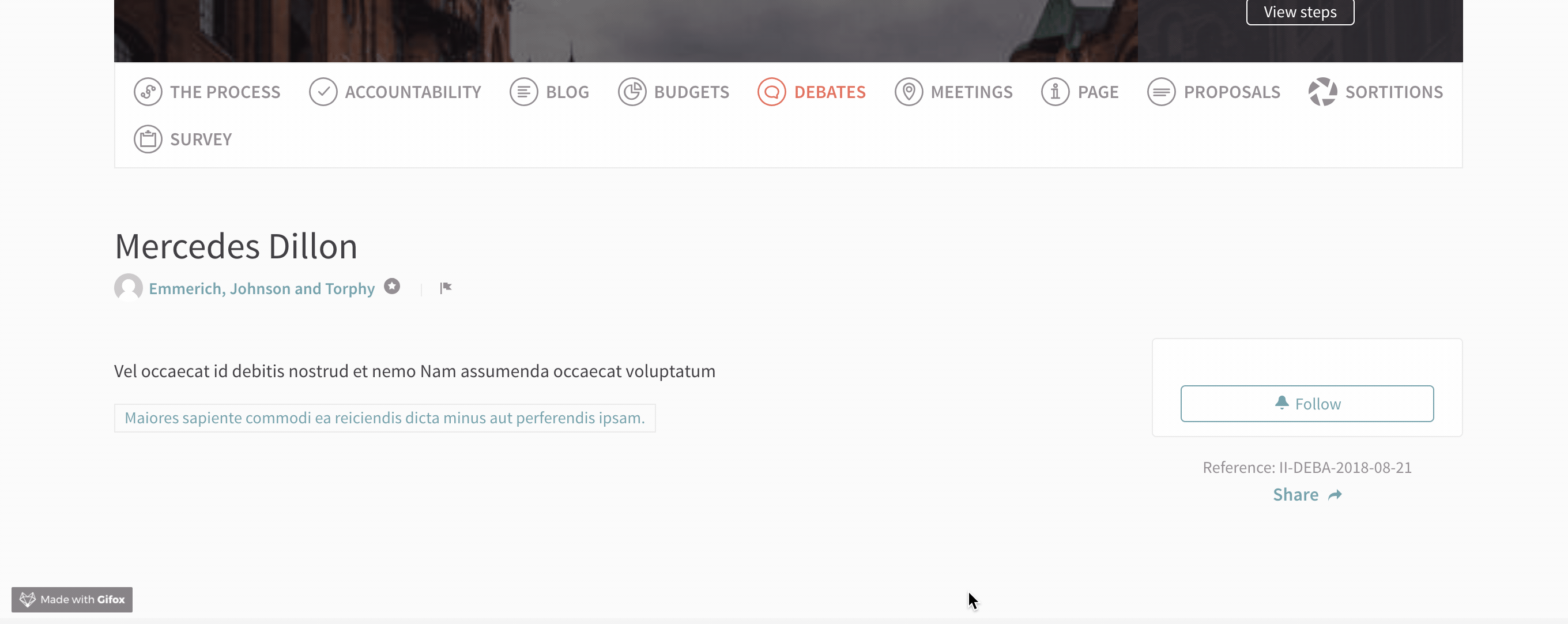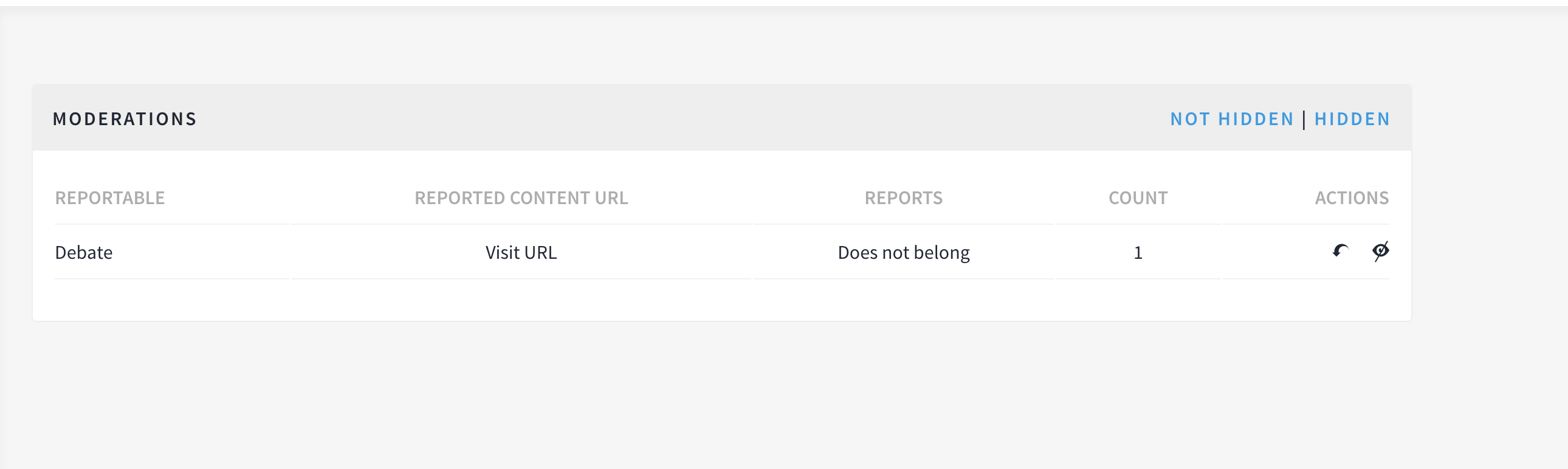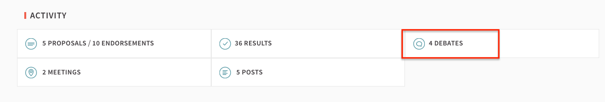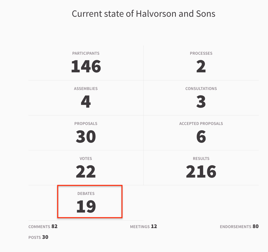Tested locally, everthing works fine ! Only problem is, when a debate is reported and then hidden, it still appears in the stats on the participatory process' show. Here I have 3 debates because I moderated one: But on the stats it says there are 4 debates: Did not count how many debates there were in total in my seeded platform, but I'm pretty sure there should be the same problem on the homepage stats section: @armandfardeau could you please make sure only the debates that are not hidden are showed in the stats ? |