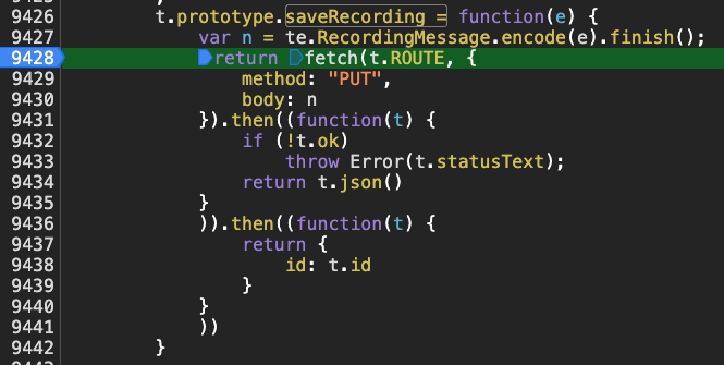 app.js) and add a breakpoint on the first line of this function:t.prototype.finishRecording = function() { if (!this.isRecording) // ADD THE BREAKPOINT HERE return null; var t = this.currentRecording; return function(t, e) { for (var n = 1 / 0, i = 0, r = t.parts; i < r.length; i++) { (l = r[i]).notes.length > 0 && (n = Math.min(n, l.notes[0].timeSeconds)) } for (var o = e - n, a = 0, s = t.parts; a < s.length; a++) for (var l, u = 0, c = (l = s[a]).notes; u < c.length; u++) { c[u].timeSeconds += o } }(t, .2), this.isRecording = !1, this.currentRecording = null, t }