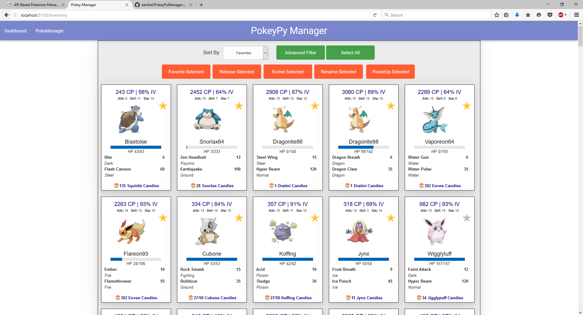 PokeyPy Manager is a tool which allows you to manage your Pokemon in Pokemon Go. It utilizes https://github.com/rubenvereecken/pokemongo-api to gather information and to perform management actions such as releasing/evolving/renaming Pokemon.