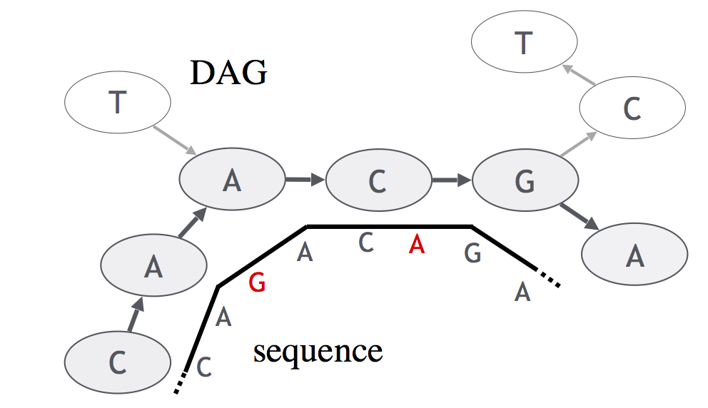 PaSGAL (Parallel Sequence to Graph Aligner) is designed to accelerate local sequence alignment of sequences to directed acyclic sequence graphs (DAGs), e.g., variation graphs, splicing graphs. The underlying algorithm is a parallelization of dynamic programming procedure for sequence to DAG alignment. With computing exact alignments being compute intensive, PaSGAL uses Advanced Vector Extensions (AVX) SIMD instructions and OpenMP to achieve high alignment performance on CPUs equipped with multiple cores and wide SIMD width. Given a set of query sequences (e.g., long PacBio/ONT or short Illumina reads) and a reference DAG, PaSGAL produces an highest scoring optimal local alignment for each query sequence along a path in the graph. Details about the algorithm and performance are available in our paper below.