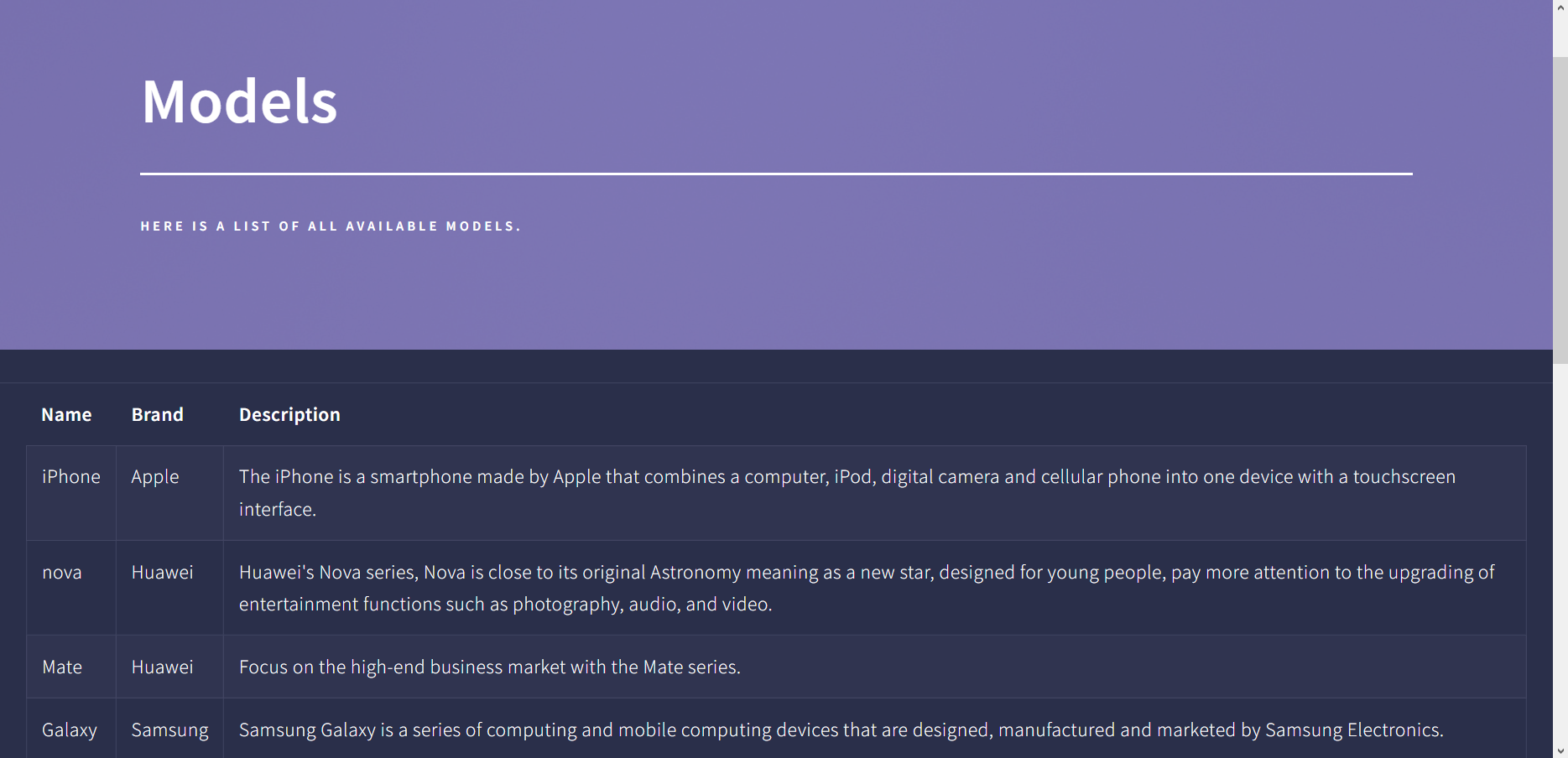 Project mobile_system is made with Laravel Framework. It contains information about phones, brands, models and years of release.