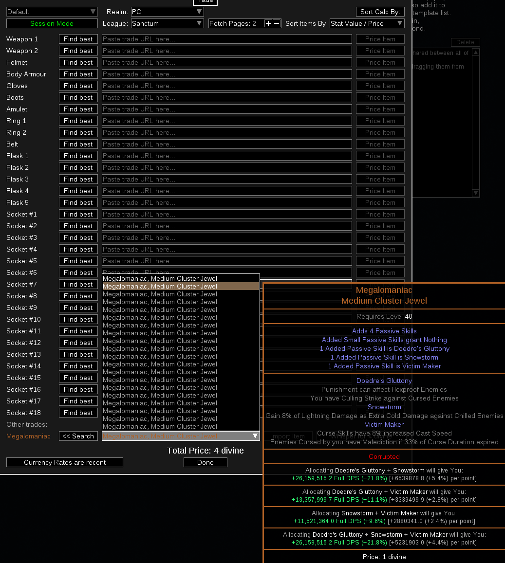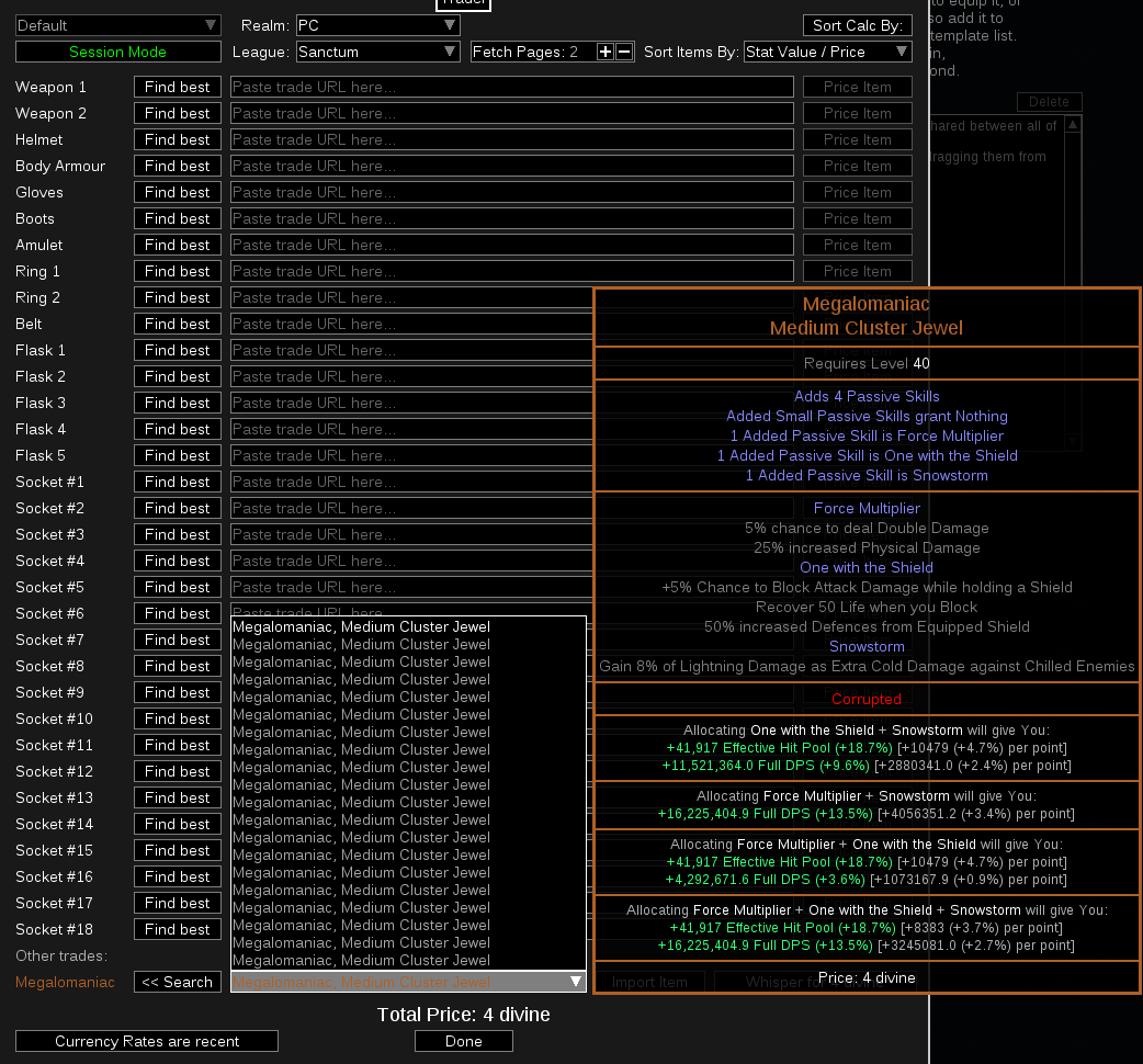 * Initial Support for sorting by different stat instead of DPS * rename calcSortIndex and apply default value checks * initial support for multiple stats * fix merge issues * fix merge issues * fix stat weight defualts and reuse old values when opening change popup * fix whitepsace * move to using a listController * update default item sort order and fix full dps issue * fix incorrect variable * fix merge issue * fix merge issues * fix merge issues * update formatting * fix spelling * update item weight and sorting to use percentage change rather than abs * ratio modweights and dont divide by 0 * change function to local * change function to local * make function not local * fix function call * Add megalomaniac search to trade tool Plus some generic improvements, including more extensible control placement, some small bug fixes and a decent bit of refactoring (i.e. renamed a lot of variables to make them more uniform) --------- Co-authored-by: Regisle <Regisle.godform@gmail.com> Co-authored-by: LocalIdentity <localidentity2@gmail.com>