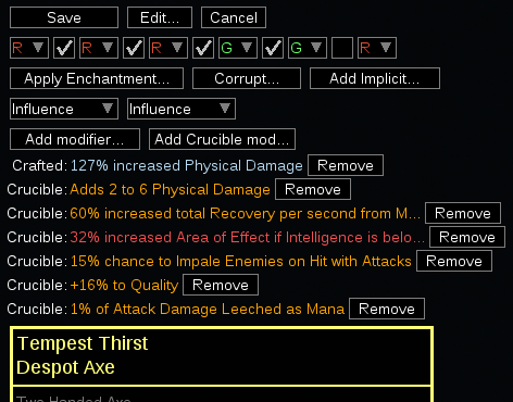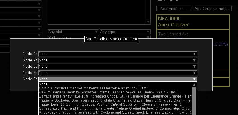 ) * Initial Support for Crucible Mods on items * Support for Crucible Mods (PathOfBuildingCommunity#6076) * add new button for crucible mods, separate by node show button only for weapons and shields * add button to remove crucible mods * refactor node dropdowns * Fix Notable export * Fix projectile speed stat * "Remove" button UI refactor "Allocate" mods - substitute id for name * checkLine update * dynamic buttons for normal,unique rarity remove crucibleControl as it is not needed * populate dropdown with active crucible mods * unique staff, sword, helmet * unique helmet update * Add blank parsing for crucible uniques * canHaveMod refactor, Quick is smart * refactor custom tagging --------- Co-authored-by: LocalIdentity <localidentity2@gmail.com> --------- Co-authored-by: LocalIdentity <localidentity2@gmail.com> Co-authored-by: Peechey <92683202+Peechey@users.noreply.github.com>