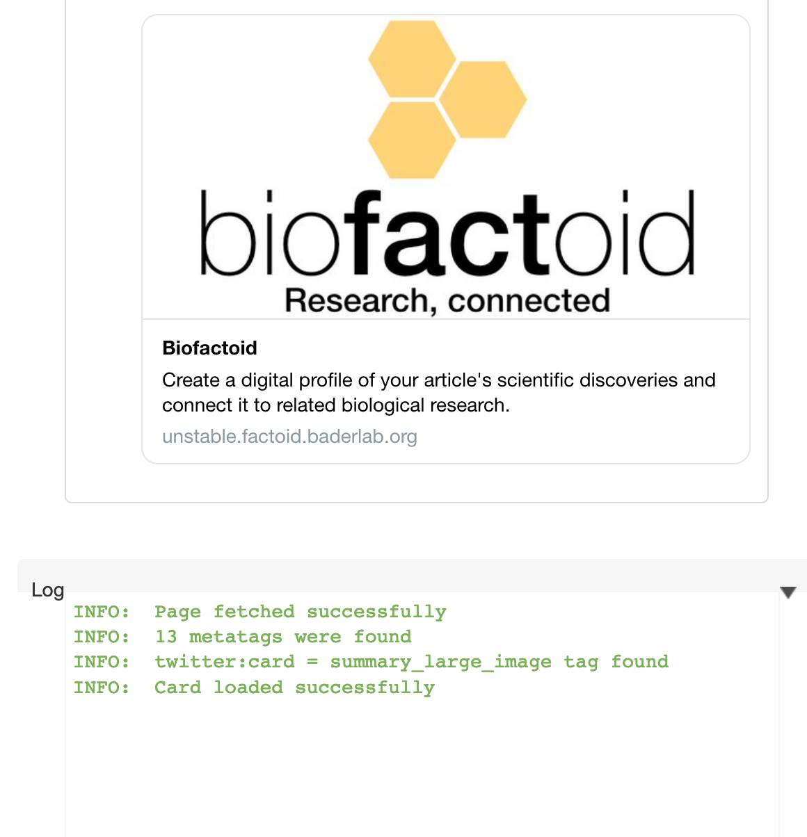 Tags for homepage: Note: The card image for twitter should be updated: https://github.com/PathwayCommons/factoid/blob/89167d817ce5f3ed868e1cd37e371b79aae5da1d/src/styles/image/card-banner.jpg |