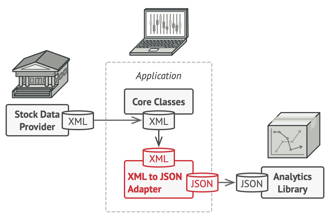 Tại một thời điểm nào đó, bạn quyết định cải thiện ứng dụng bằng cách tích hợp thư viện phân tích thông minh của bên thứ 3. Nhưng có một nhược điểm: thư viện phân tích chỉ hoạt động với dữ liệu ở định dạng JSON. Bạn có thể thay đổi thư viện để hoạt động với XML. Tuy nhiên, điều này có thể phá vỡ cấu trúc một số mã hiện có dựa trên thư viện. Và tệ hơn, bạn có thể không có quyền truy cập vào mã nguồn của thư viện ngay từ đầu, khiến phương pháp này không thể thực hiện được.