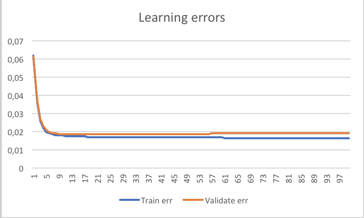 Also a csv file with the train and validate error for each cycle, the neuron output for the test data and the weights used. So you can make cool charts like this: