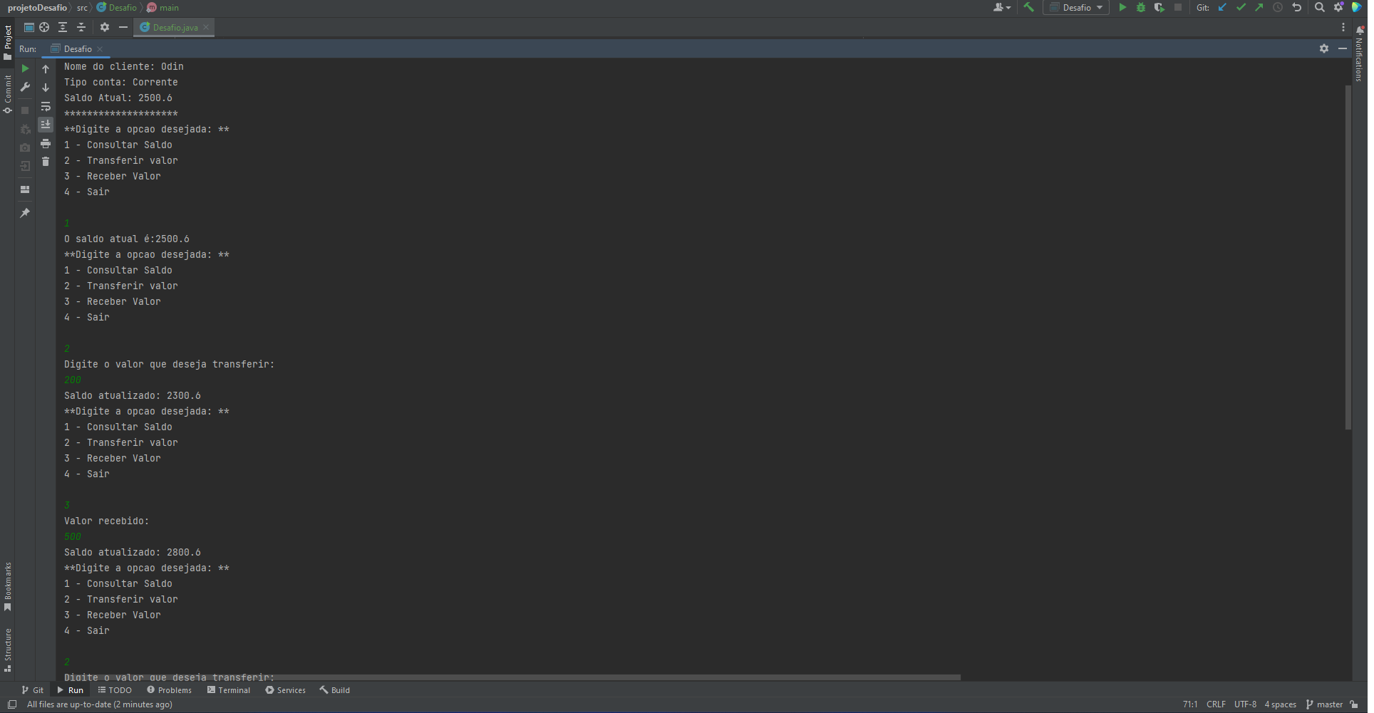 Projeto realizado através do desafio proposto no curso da alura. A aplicação mostra o saldo inicial de uma conta fictícia, e através do menu é possível escolher a operação que deseja realizar. A cada operação realizada o saldo atualizado é mostrado para o usuário. Ainda existe a validação da opção digitada.