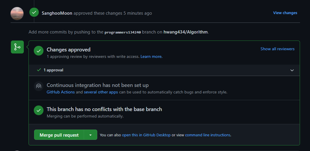 PR을 날리시면 바로 Merge가 가능한 상태였는데, 리뷰 및 승인을 해주셔야 Merge가 가능합니다.