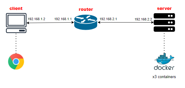 Our client will run the software necessary for the performance evaluation, on the other hand the server will run 3 Docker containers deploying the html pages.