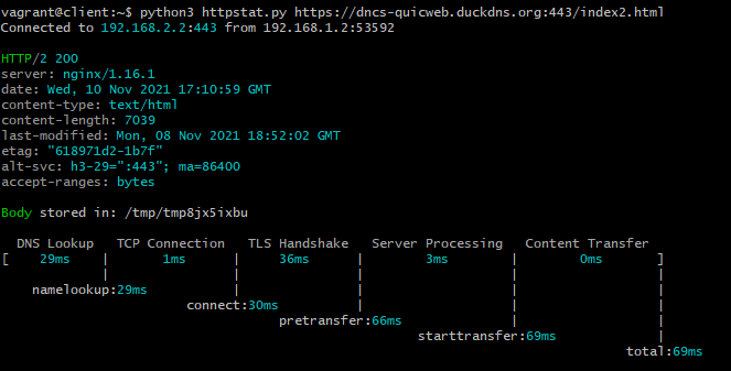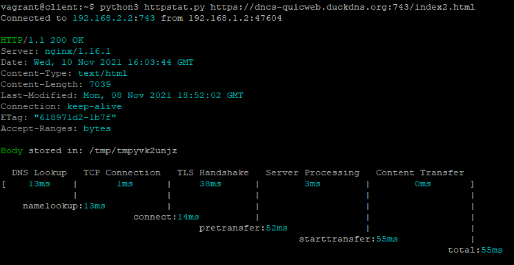 First, to have a brief overview of what has to be expected, we have a look at httpstat's output (of index2.html web page)