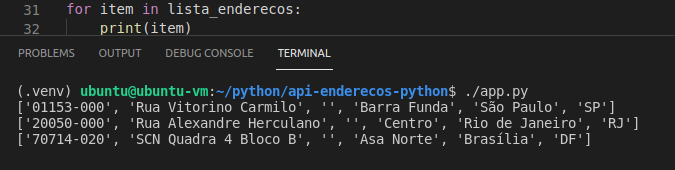 print(item)Importante: A utilização da API do Via CEP aqui é somente com a intenção de contextualizar como seria a execução de requisições para uma determinada API com auxílio da linguagem Python, pois no mercado existem várias empresas que fornecem esse tipo de serviço pago e que seria o mais adequado para solucionar questões desse tipo.