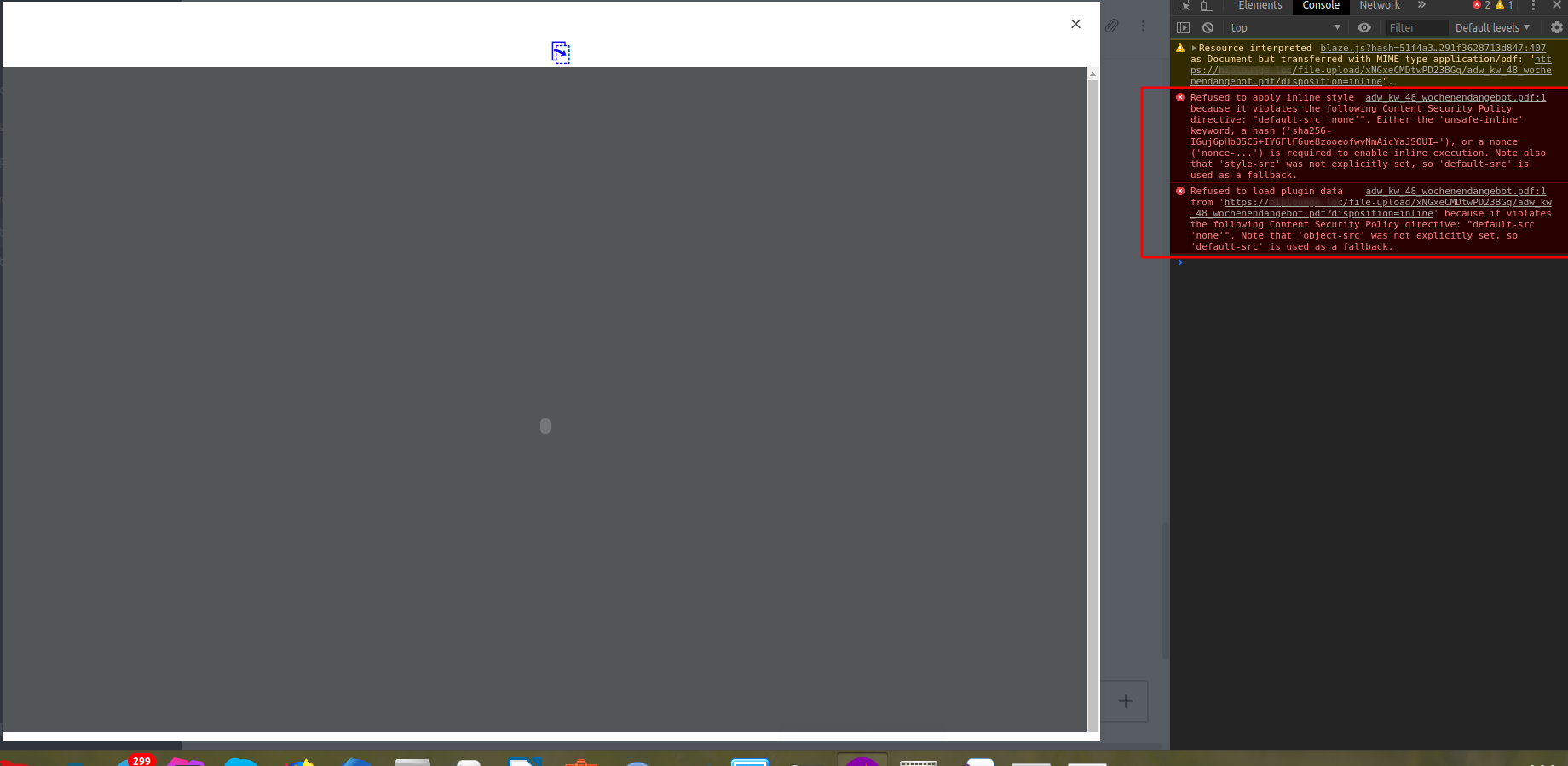 Moreover, using this workaround, I achieved that I was loading into a modal window in the browser, but not until the end. There are problems with CSP: