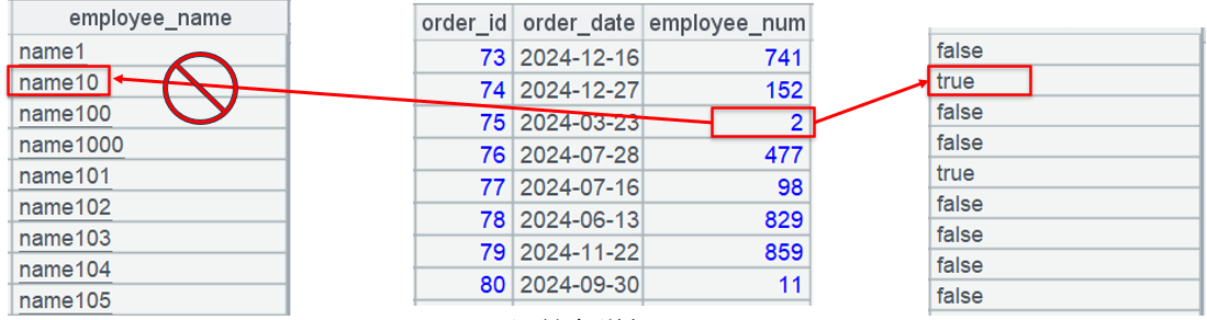 To perform filtering on orders table (the one in the middle), the regular method is to get employee name at the corresponding position from employee table (the one on the left) according to employee_num value and to compare the current name with sequence [“name10”,“name101”].
