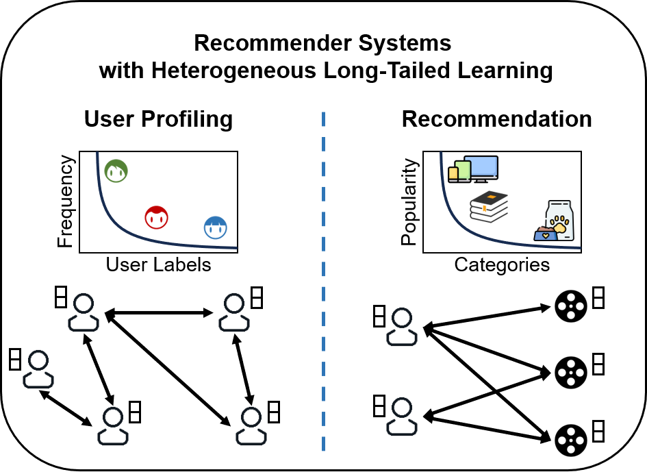 Here, we present a motivative application of the recommendation system, which naturally exhibits long-tailed data distributions coupled with data complexity [2] (e.g., tabular data and relational data) and task heterogeneity (e.g., user profiling [1] and recommendation [2]).