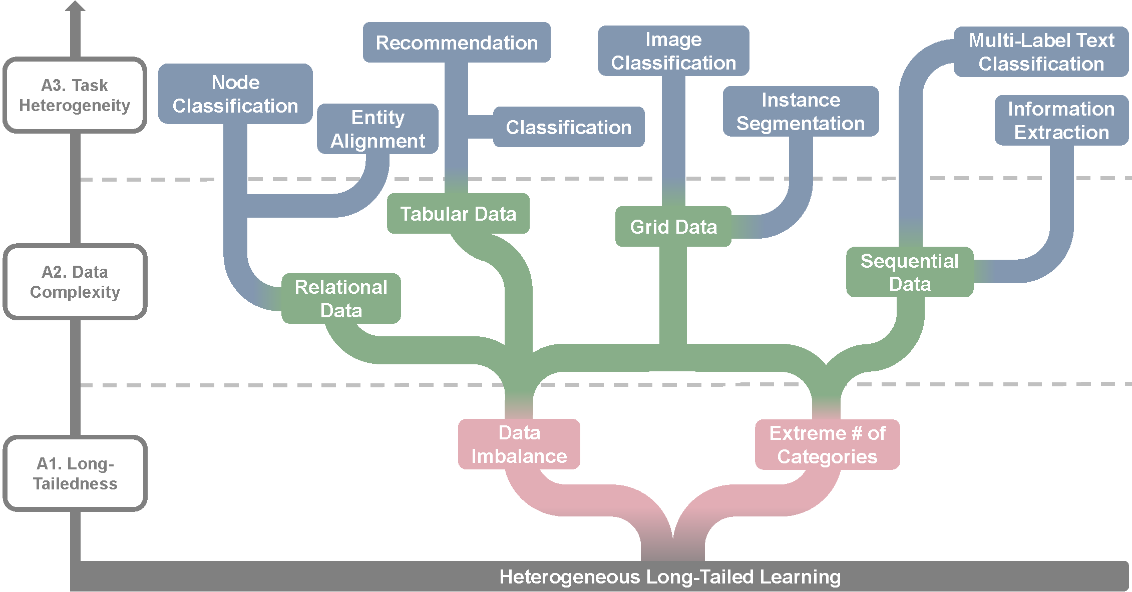 - (A2) the data complexity of various domains: a wide range of complex domains may naturally encounter long-tailed distribution, e.g., tabular data, sequential data, grid data, and relational data; and
