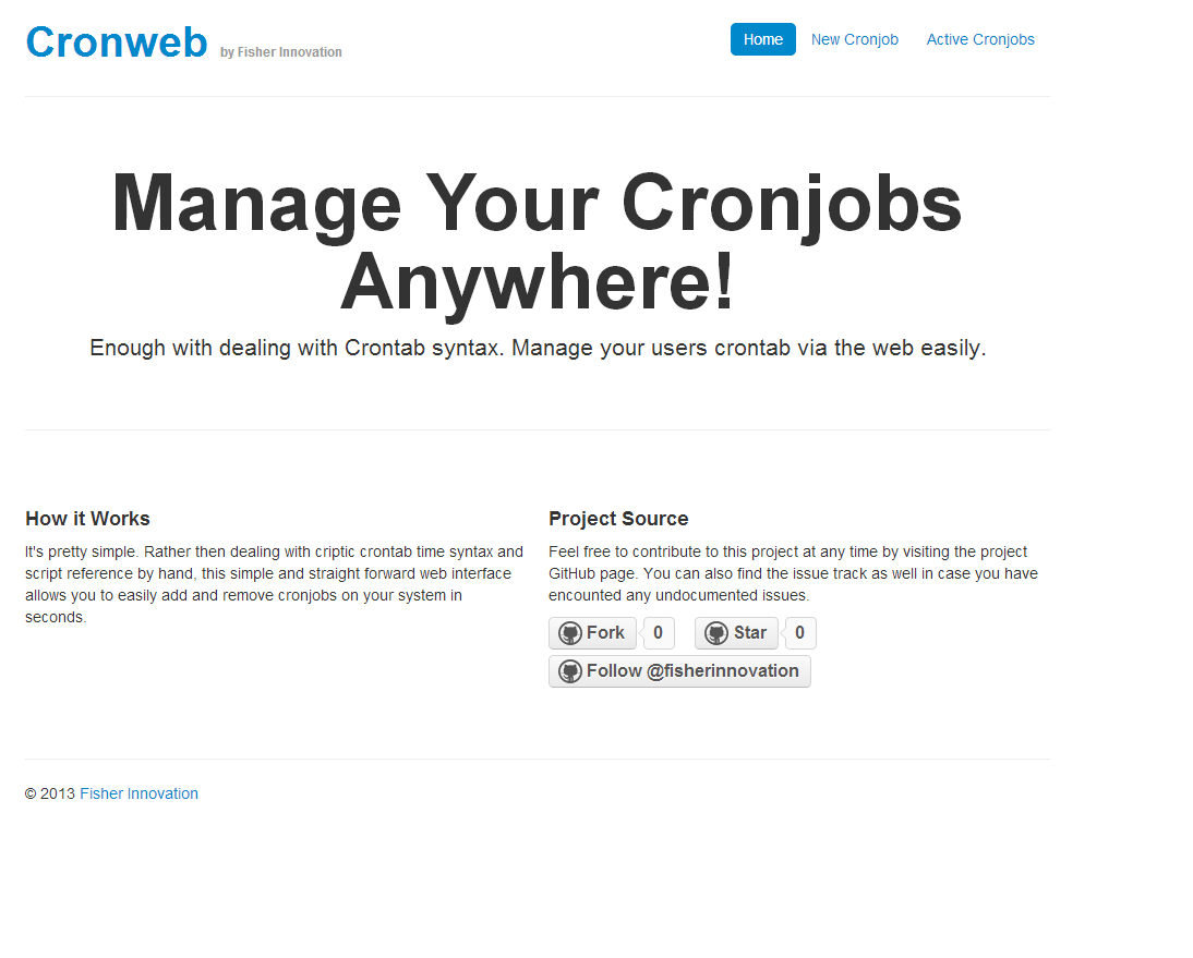 Fisher Innovation CronWeb is a responsive HTML5/PHP crontab manager. It's pretty simple. Rather then dealing with criptic crontab time syntax and script reference by hand, this simple and straight forward web interface allows you to easily add and remove cronjobs on your system in seconds.