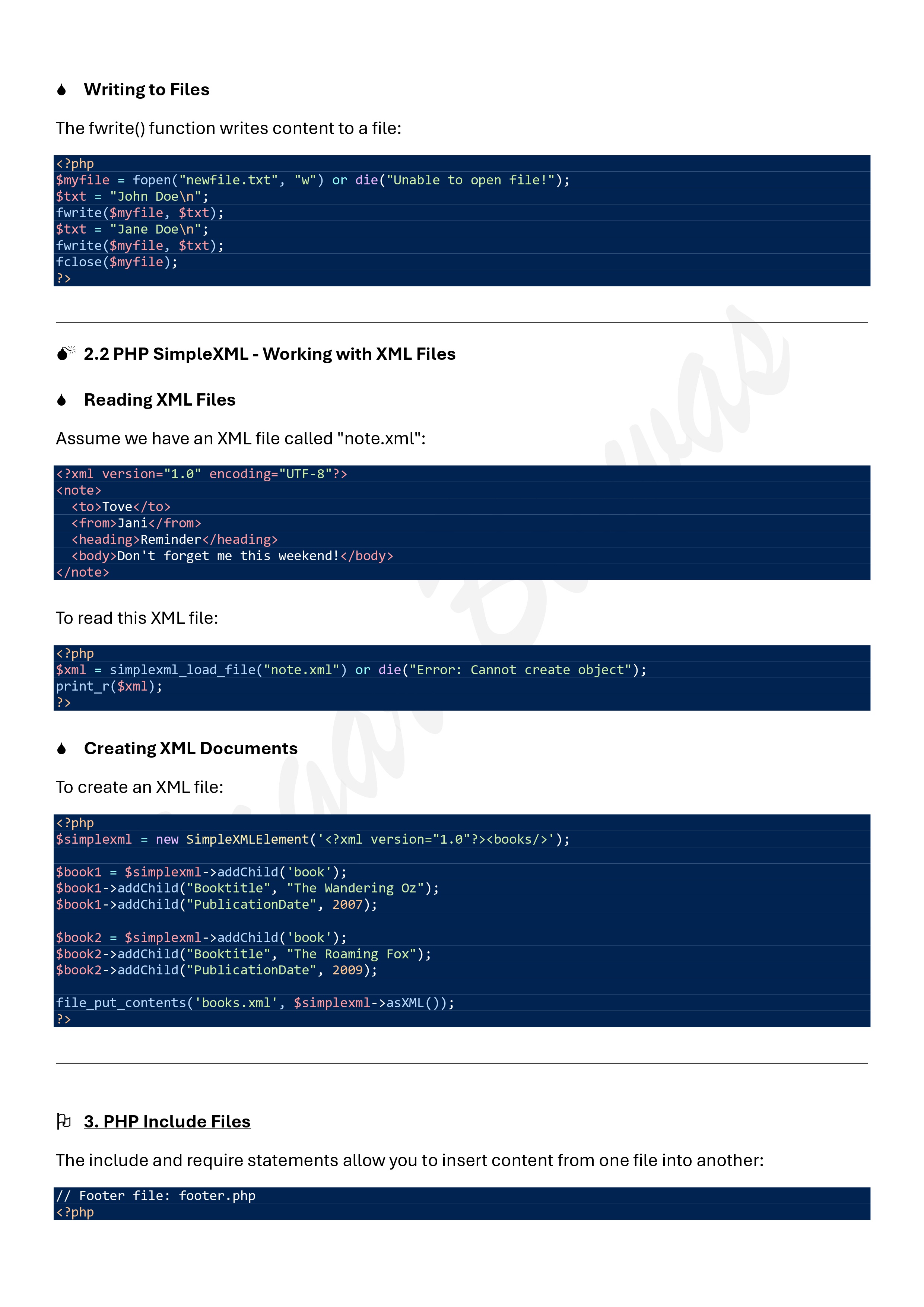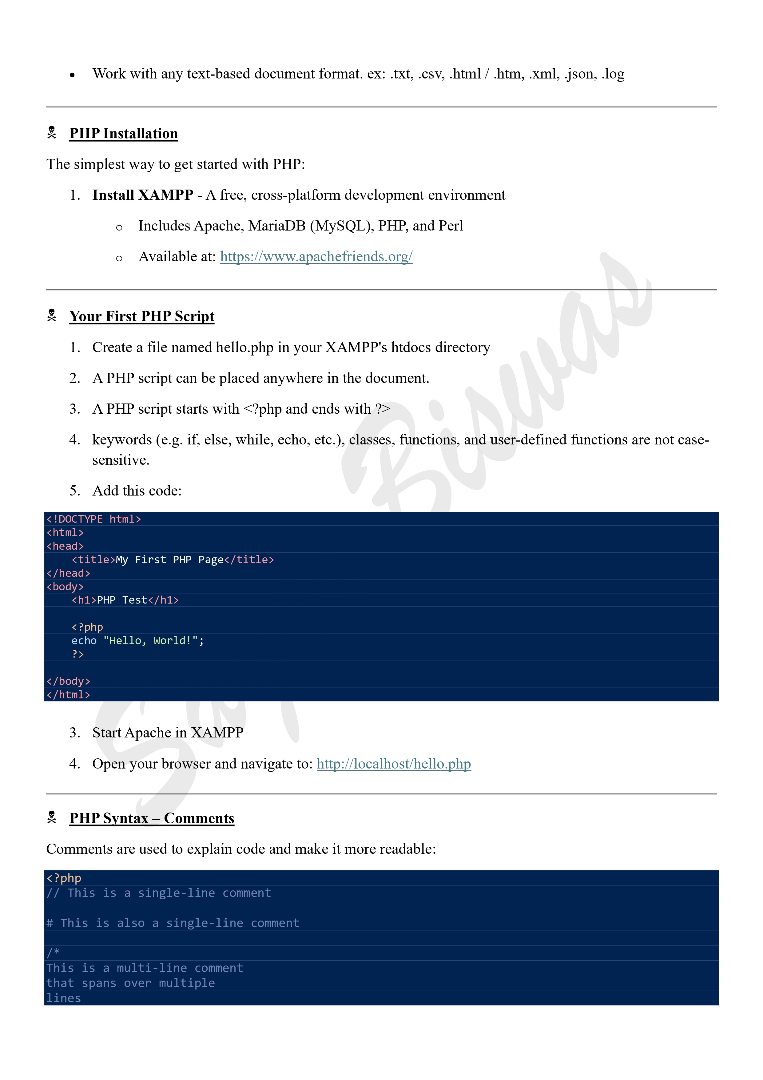 A structured PHP learning notebook series covering PHP fundamentals, secure form validation, sessions & cookies, database access, MySQL integration, MVC architecture, and AJAX/JSON. Each part is presented as PDF-style visual handbooks for beginners and web security–aware learners.