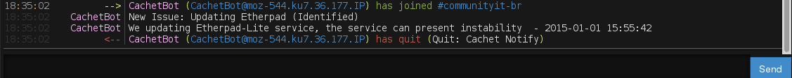 server: The IRC server addressport: The IRC server portnick: Nick that the bot will usereceivers: Nicks and Channels to send the notification(separated by comma)ssl: Enable or Disable SSL connection