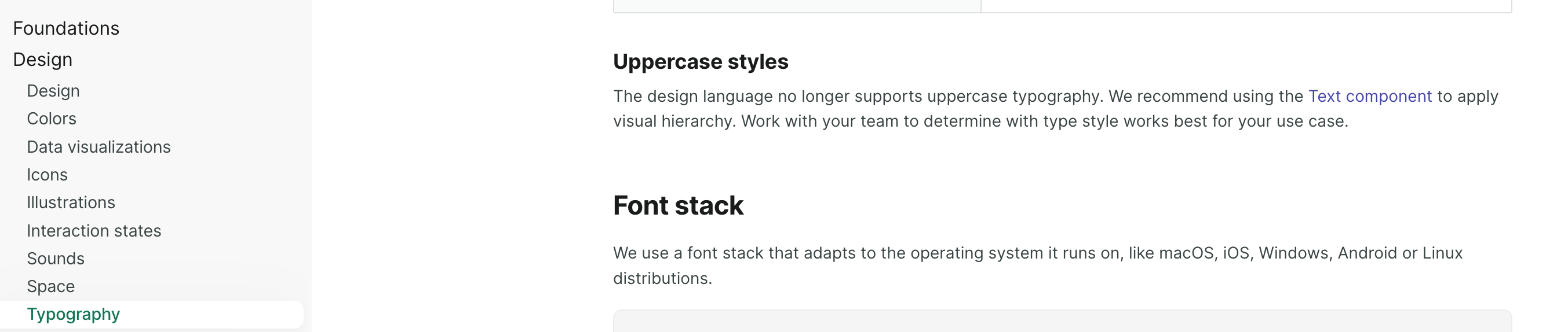 ### WHY are these changes introduced? Added a section to Design/Typography in the style guide to call out that the design system no longer supports uppercase typography styles. ### WHAT is this pull request doing? <img width="1353" alt="01-30-evh8p-8m14u" src="https://user-images.githubusercontent.com/26749317/216118646-fafc6bda-4044-4e94-a25e-6157ac361485.png"> ### How to 🎩 🖥 [Local development instructions](https://github.com/Shopify/polaris/blob/main/README.md#local-development) 🗒 [General tophatting guidelines](https://github.com/Shopify/polaris/blob/main/documentation/Tophatting.md) 📄 [Changelog guidelines](https://github.com/Shopify/polaris/blob/main/.github/CONTRIBUTING.md#changelog) ### 🎩 checklist - [ ] Tested on [mobile](https://github.com/Shopify/polaris/blob/main/documentation/Tophatting.md#cross-browser-testing) - [ ] Tested on [multiple browsers](https://help.shopify.com/en/manual/shopify-admin/supported-browsers) - [ ] Tested for [accessibility](https://github.com/Shopify/polaris/blob/main/documentation/Accessibility%20testing.md) - [ ] Updated the component's `README.md` with documentation changes - [x] [Tophatted documentation](https://github.com/Shopify/polaris/blob/main/documentation/Tophatting%20documentation.md) changes in the style guide --------- Co-authored-by: aveline <aveline@users.noreply.github.com>
