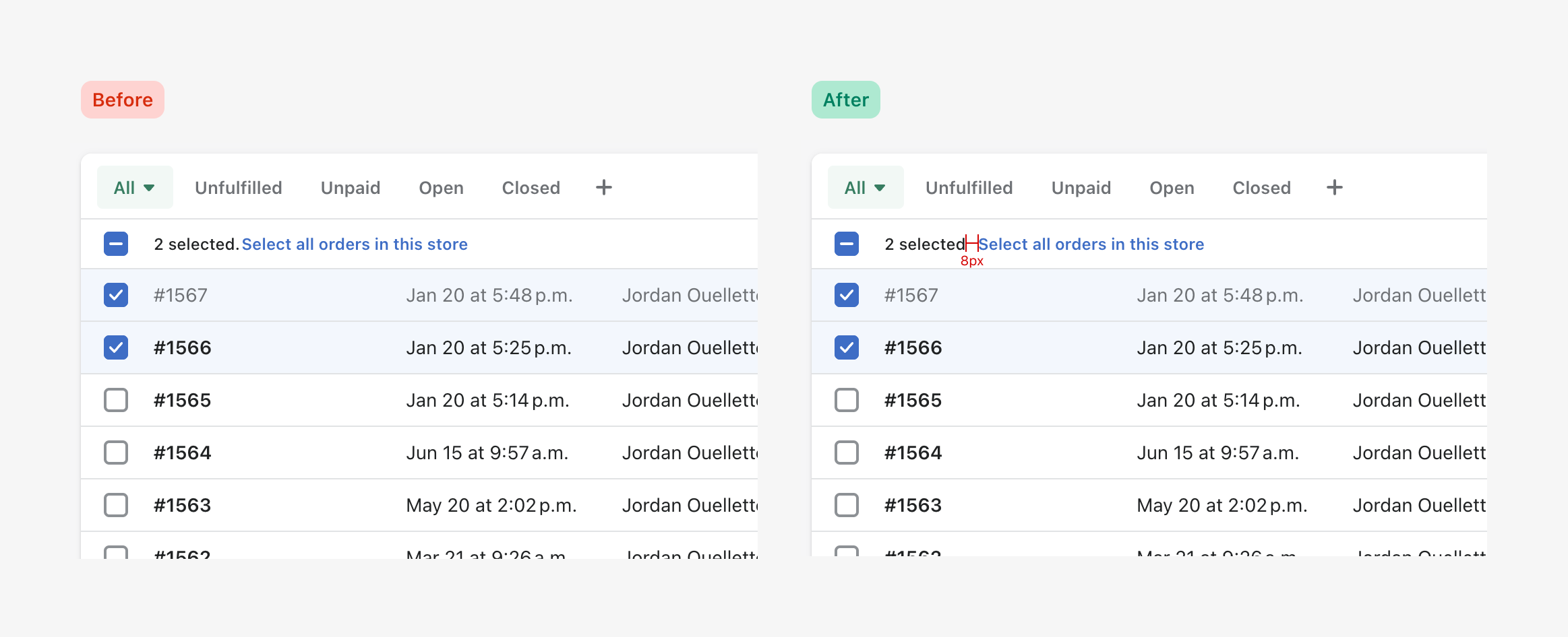 When bulk selecting on the Index Table, the gap between the action and string is very minimal and confusing. Expand the mockup above for specifications