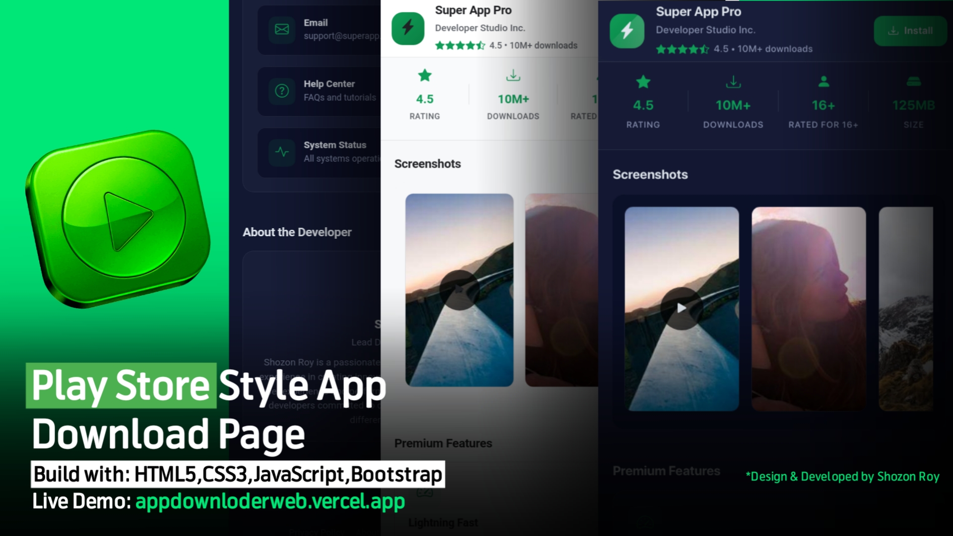 A pixel-perfect, responsive web template that recreates the Google Play Store app detail and download UI using HTML, CSS, and JavaScript. This project is ideal for showcasing your mobile app with a professional, familiar interface that users instantly recognize.