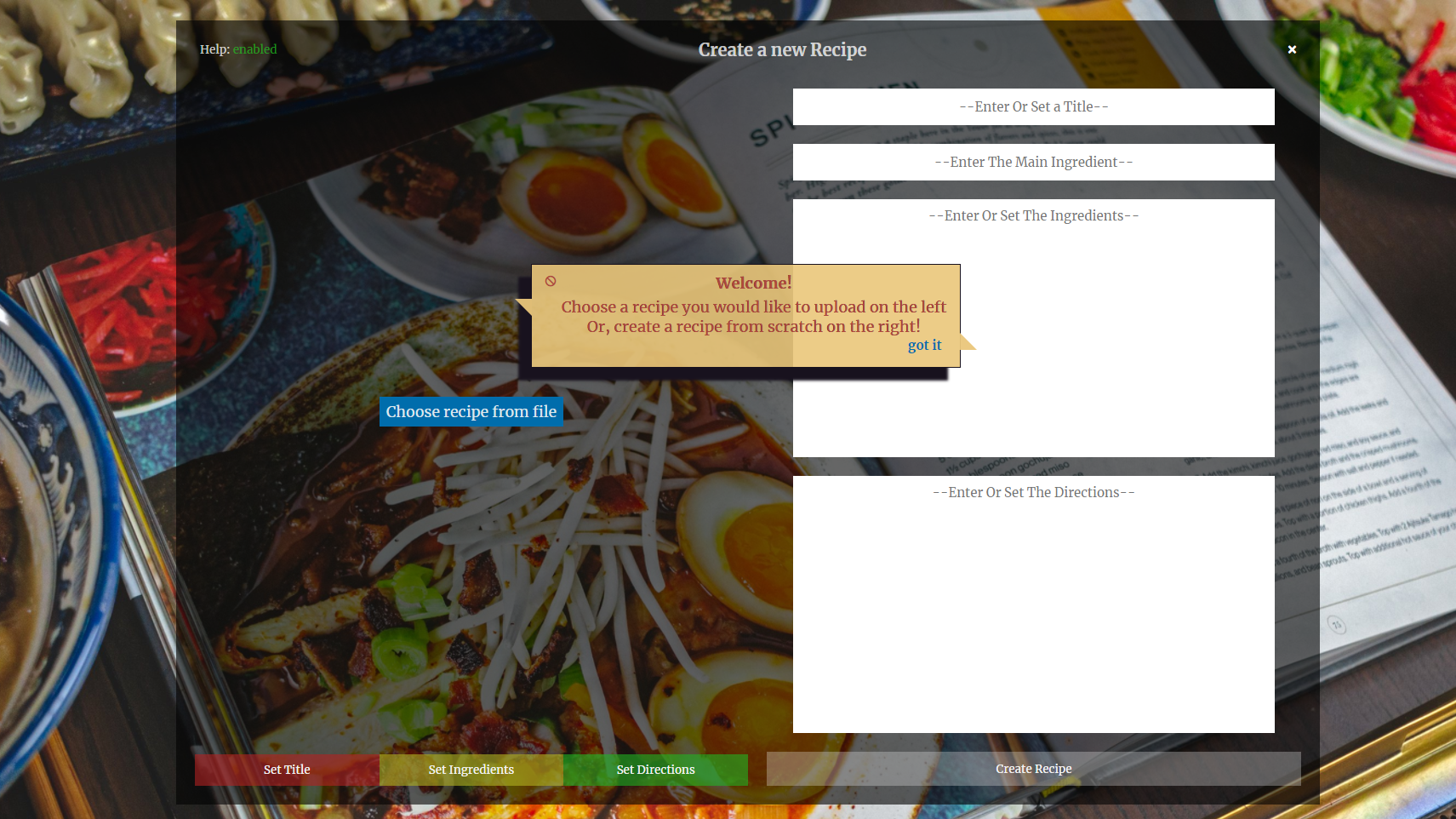 To create a new recipe the user can either enter a recipe from scratch or use a picture stored on their computer.
