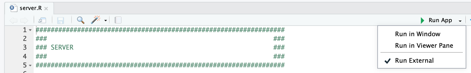 and clicking the "Run App" button at the top of the application, after opening the server.R file. We recommend checking the "Run External" option to open the application in your default browser instead of the RStudio Viewer.