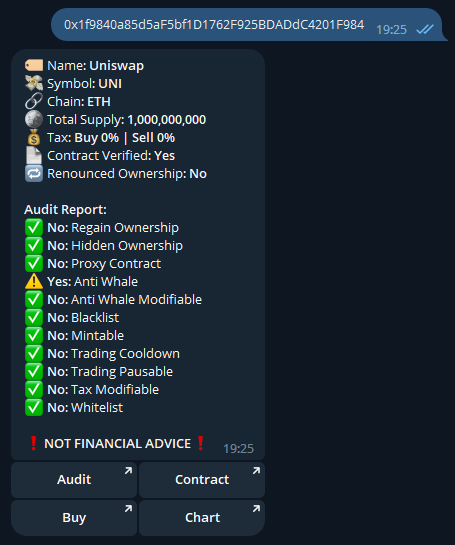 This is a Telegram bot for audit contracts in blockchains (Ethereum, BSC, Polygon, Avalanche, Fantom)