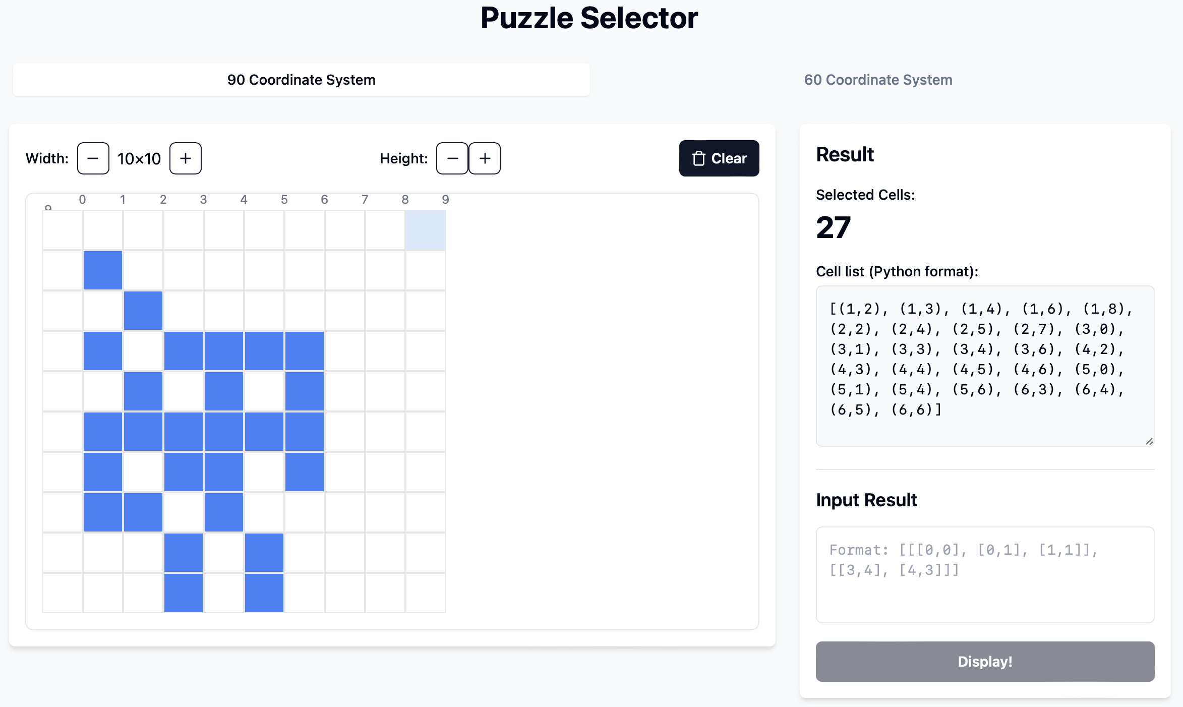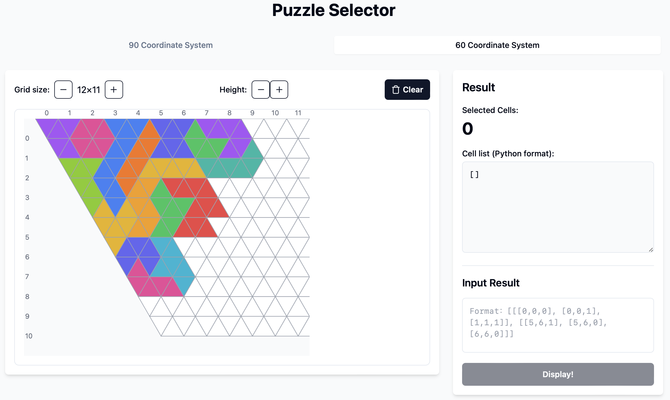 This repo is an auxiliary tool for my PuzzleSolver project. It provides interactive webpage to quickly select cells and display the corresponding index, thus reducing manual input. The tool can be easily incorporated when creating interesting puzzles like Polyminoes and Polyiamonds.